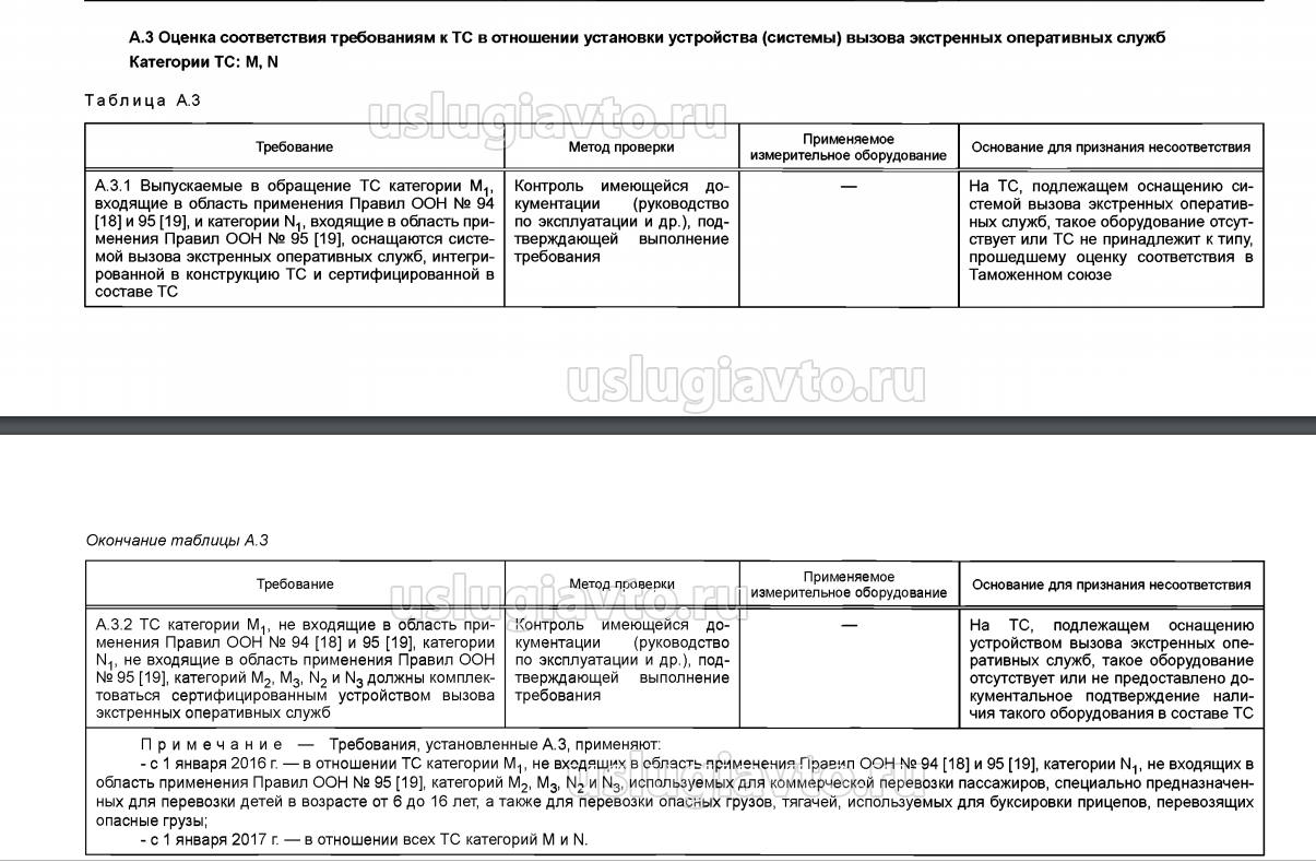 4. Требования таблицы А3 "Оценка соответствия требованиям к ТС в отношении установки устройства (системы) вызова экстренных оперативных служб" для ввозимых единичных ТС не выполнимы, поскольку почти все ввозимые на территорию Таможенного союза единичные транспортные средства не имеют оборудования УВЭОС и не принадлежат к типу, прошедшему оценку соответствия в Таможенном союзе.