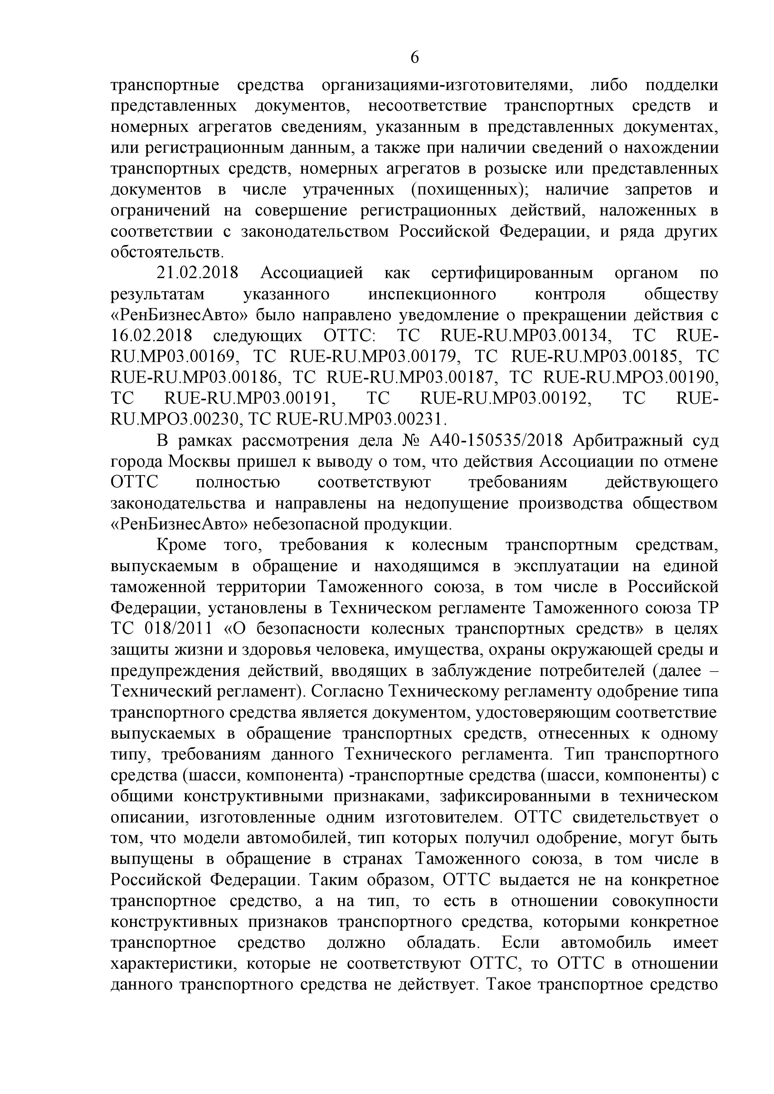 Для справки: органом по сертификации по результатам инспекционного контроля обществу «РенБизнесАвто» было направлено уведомление о прекращении действия с 16.02.2018 следующих ОТТС: ТС RUE-RU.МР03.00134, ТС RUERU.MP03.00169, ТС RUE-RU.MP03.00179, ТС RUE-RU.MP03.00185, ТС RUE-RU.MP03.00186, ТС RUE-RU.MP03.00187, ТС RUE-RU.MPO3.00190, ТС RUE-RU.MP03.00191, ТС RUE-RU.MP03.00192, ТС RUERU.MPO3.00230, ТС RUE-RU.MP03.00231. Общее количество транспортных средств с аннулированной регистрацией на шасси КАМАЗ, поизведенных ООО "Ренбизнесавто" составляет более 6000 штук.